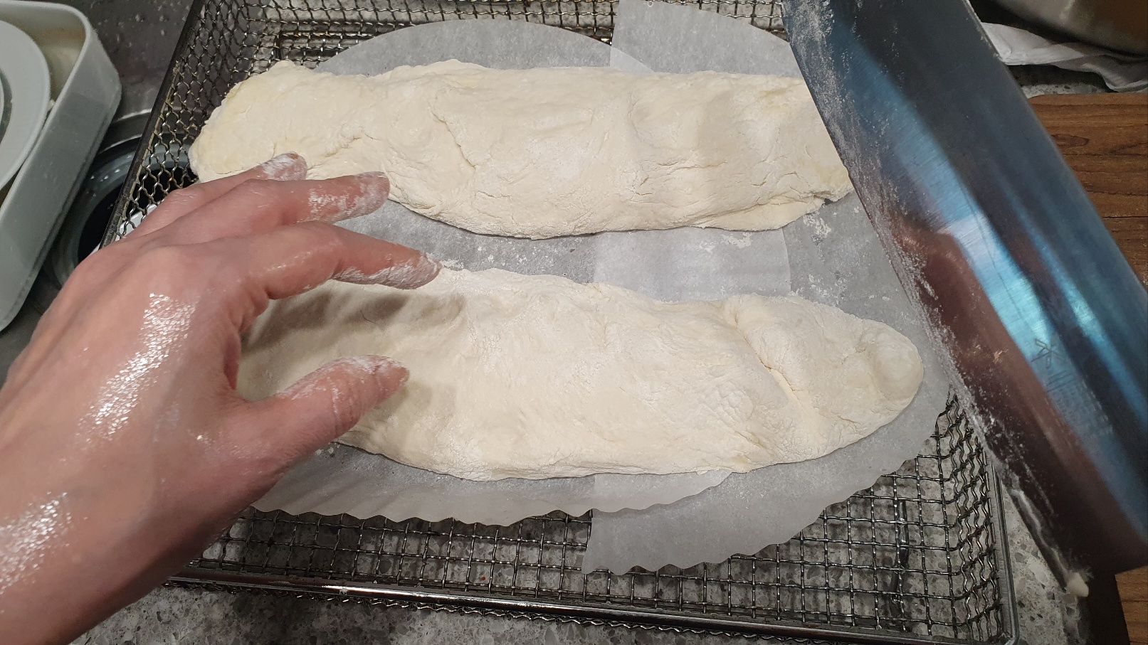10시간 발효시킨 반죽을 주걱이나 손으로 살살 포개주면서 빵을 바게트 모양으로 만들어 주세요.