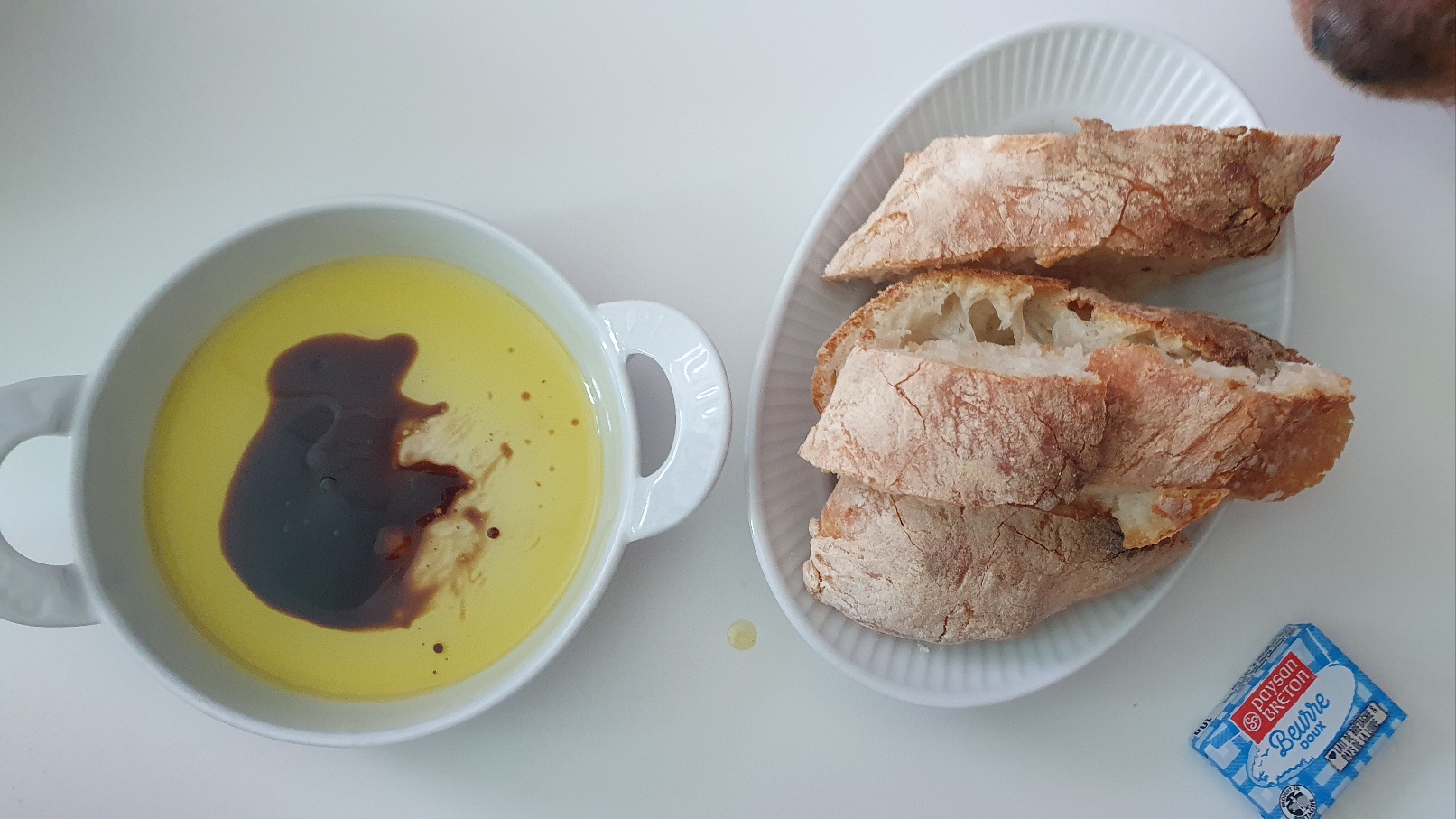 기다리는 동안 바게트하고 같이 먹을 발사믹 올리브오일 소스를 만들고, 냉동실에 있는 버터도 꺼내 놓았어요.