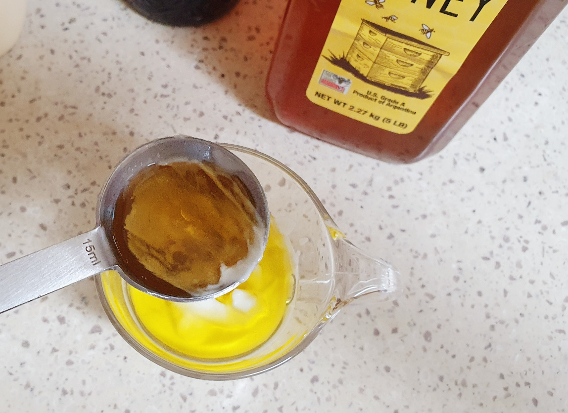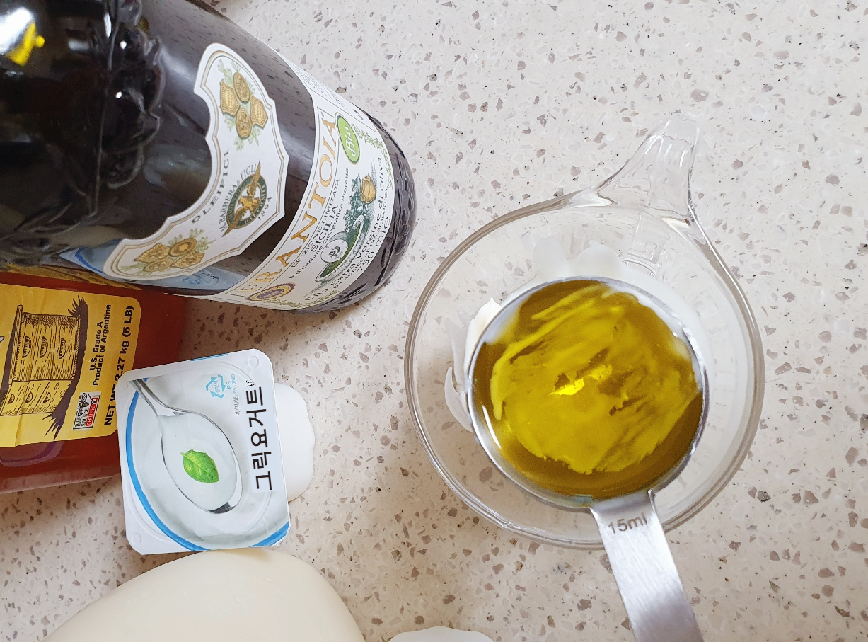 그릭요거트 1 큰술, 마요네즈 1 큰술, 올리브 오일 1 큰술, 꿀 또는 알룰로스 반 큰 술을 그릇에 담고 골고루 섞어주세요.