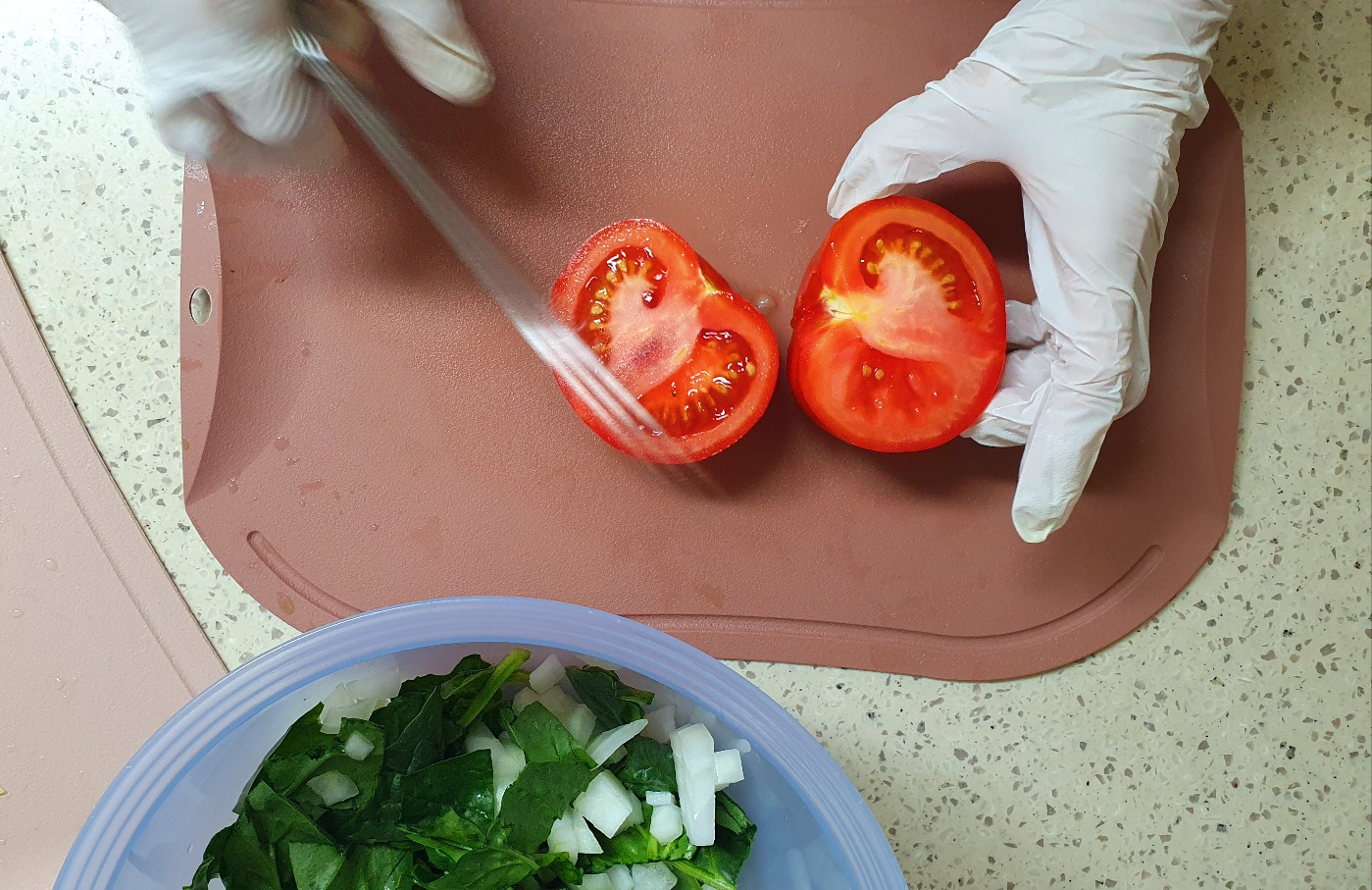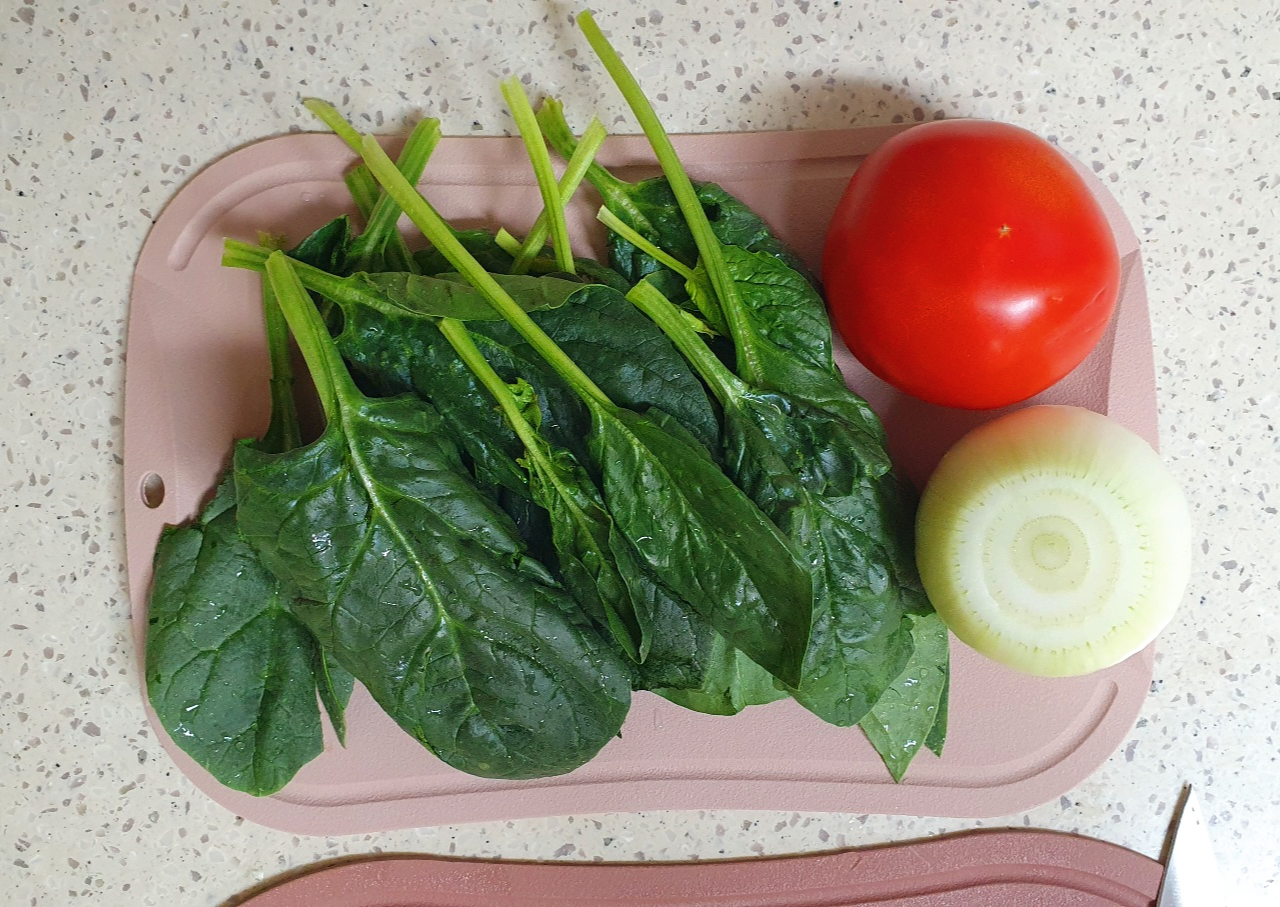 시금치, 토마토, 양파를 깨끗하게 씻어서 준비해 주세요.